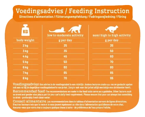 Ligt jouw pluizenbol het liefste de hele dag voor het raam? Dan valt hij of zij onder een kat met lage tot gemiddelde activiteit. Als je jouw kat Adult with Chicken voert en jouw kat 4 kg weegt betekent dit dat het wordt aangeraden om per dag 45 gram voer te geven. Je kan de maatbeker 45 gram bij nummer 1!