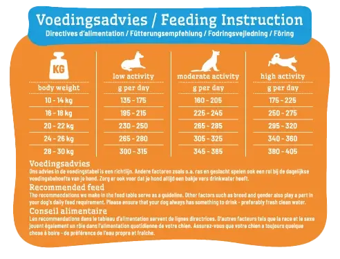 Op de zak voer kan je de voedingsadviezen vinden waarop staat hoeveel gram voer er bij jouw trouwe viervoeter hoort. Het aantal gram voer wordt bepaald door het gewicht van je dier en hoe actief hij of zij is.