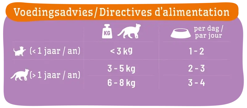 Ons advies in de voedingstabel en calculator is een richtlijn. Andere factoren zoals o.a. ras, beweging en geslacht spelen ook een rol bij de dagelijkse voedingsbehoefte van je dier. Blijf naar je dier kijken en pas de hoeveelheid aan wanneer nodig. Zorg er ook voor dat je dier altijd een bakje vers drinkwater heeft. Wij adviseren om de voeding voor de aangegeven houdbaarheidsdatum aan je dier te serveren. Sluit de verpakking na openen weer zorgvuldig af en bewaar de voeding altijd op een koele en droge plaats.