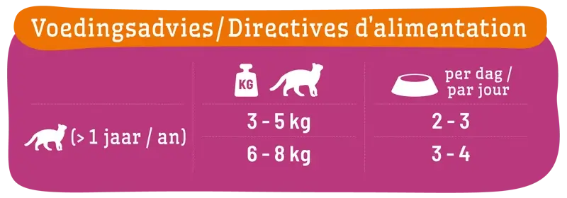 Ons advies in de voedingstabel en calculator is een richtlijn. Andere factoren zoals o.a. ras, beweging en geslacht spelen ook een rol bij de dagelijkse voedingsbehoefte van je dier. Blijf naar je dier kijken en pas de hoeveelheid aan wanneer nodig. Zorg er ook voor dat je dier altijd een bakje vers drinkwater heeft. Wij adviseren om de voeding voor de aangegeven houdbaarheidsdatum aan je dier te serveren. Sluit de verpakking na openen weer zorgvuldig af en bewaar de voeding altijd op een koele en droge plaats.