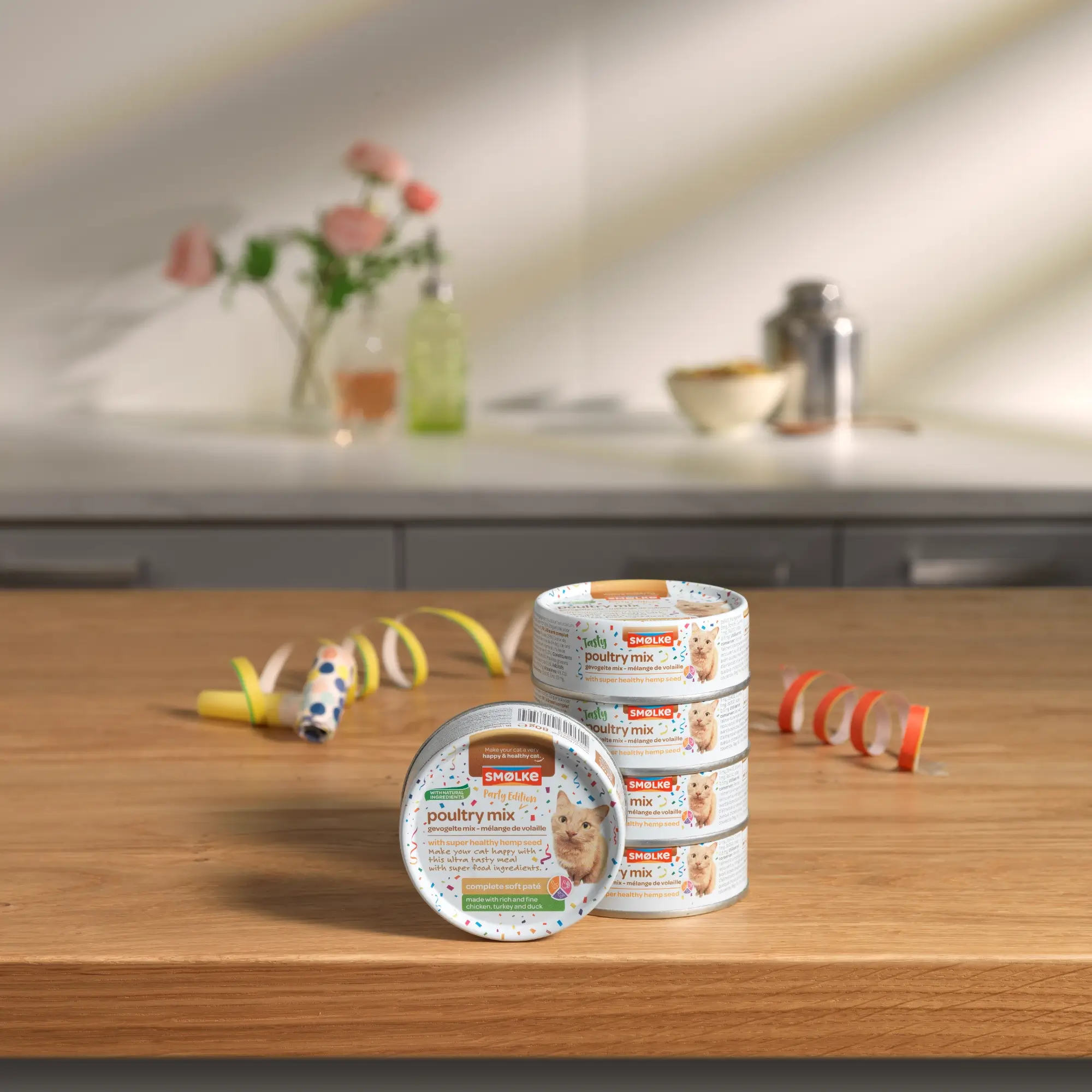C’est la fête aujourd’hui. Il suffit de regarder dans la gamelle : il y a du Smølke Soft Paté Party Edition. En langage félin, il s’agit d’un repas de luxe dans un emballage de fête. Du poulet, de la dinde et du canard, enrichis de graines de chanvre et d’huile de saumon. Et la texture ultra-moelleuse en fait un repas absolument « chat-voureux ». Un véritable délice à servir les jours où votre chat mérite lui aussi un petit festin.