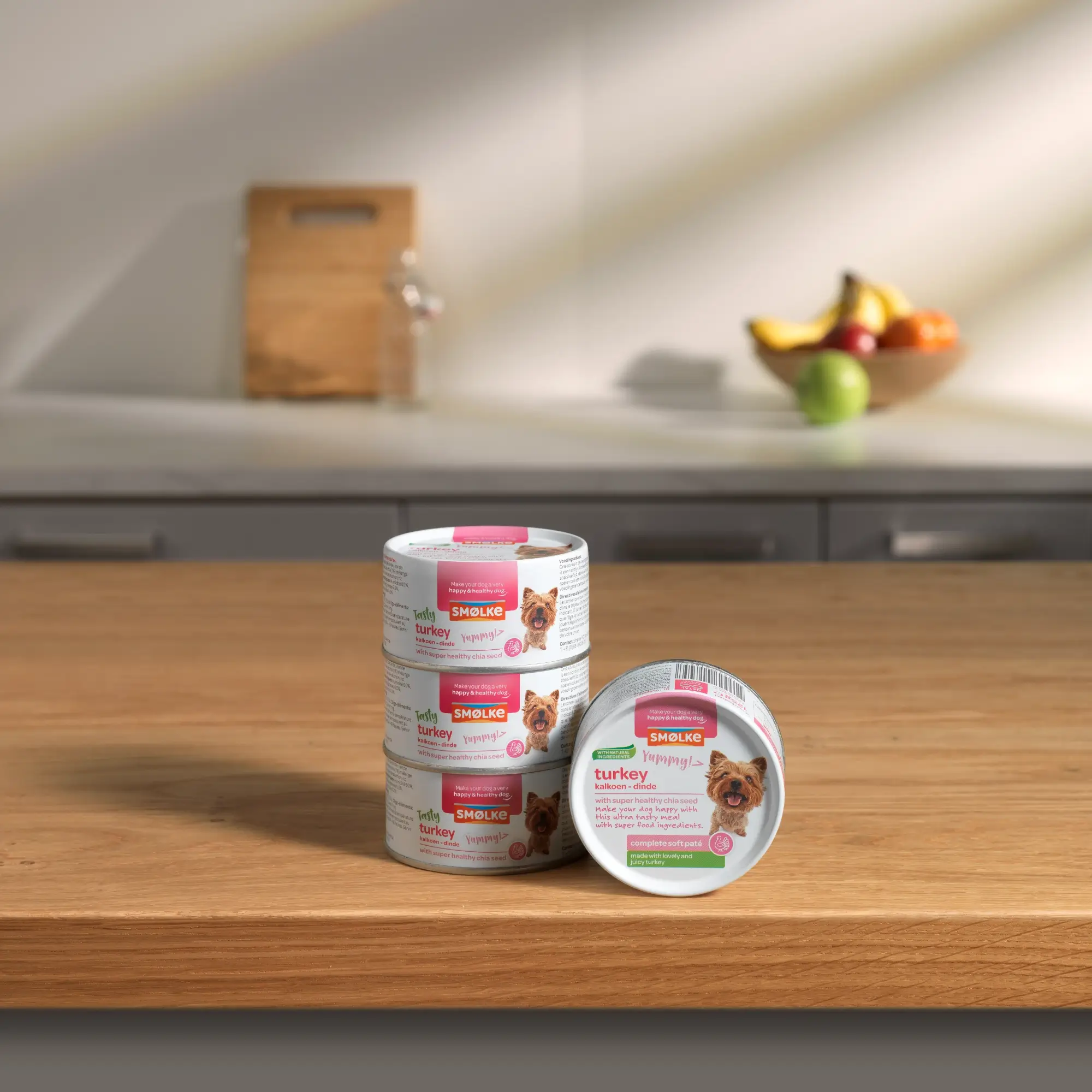 Vous pensez qu’il est important de varier de temps en temps l’alimentation de votre chien ? Faites-le avec une variante absolument délicieuse : le Smølke Soft Paté Turkey. C’est l’aliment préféré de tous les chiens, dont l’ingrédient principal est la dinde à la texture très moelleuse. Il s’agit également d’un repas complet, grâce à l’ajout de graines de chia.