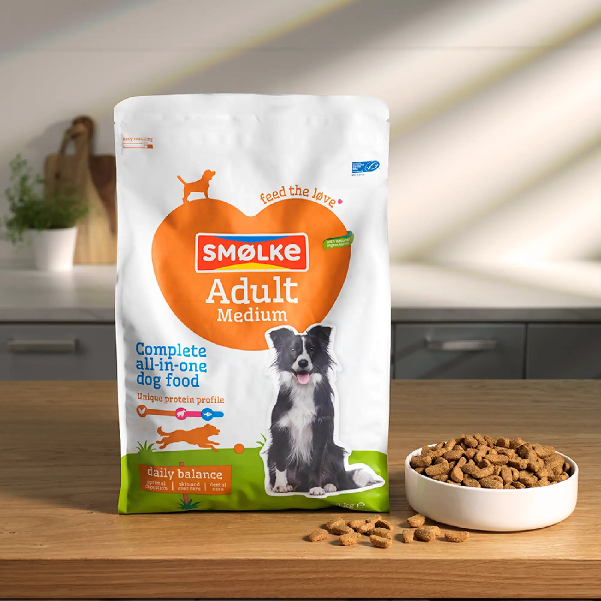 Of het gewicht van je hond uitmaakt voor de voeding? Reken maar. Grotere honden hebben niet alleen extra trek, maar ook andere behoeften. Laat het menu gerust maar aan Smølke over. Van kip, vis en lam maken we de lekkerste hondenbrokken. En ondertussen krijgt je hond met Adult Medium ook nog belangrijke bouwstoffen binnen.