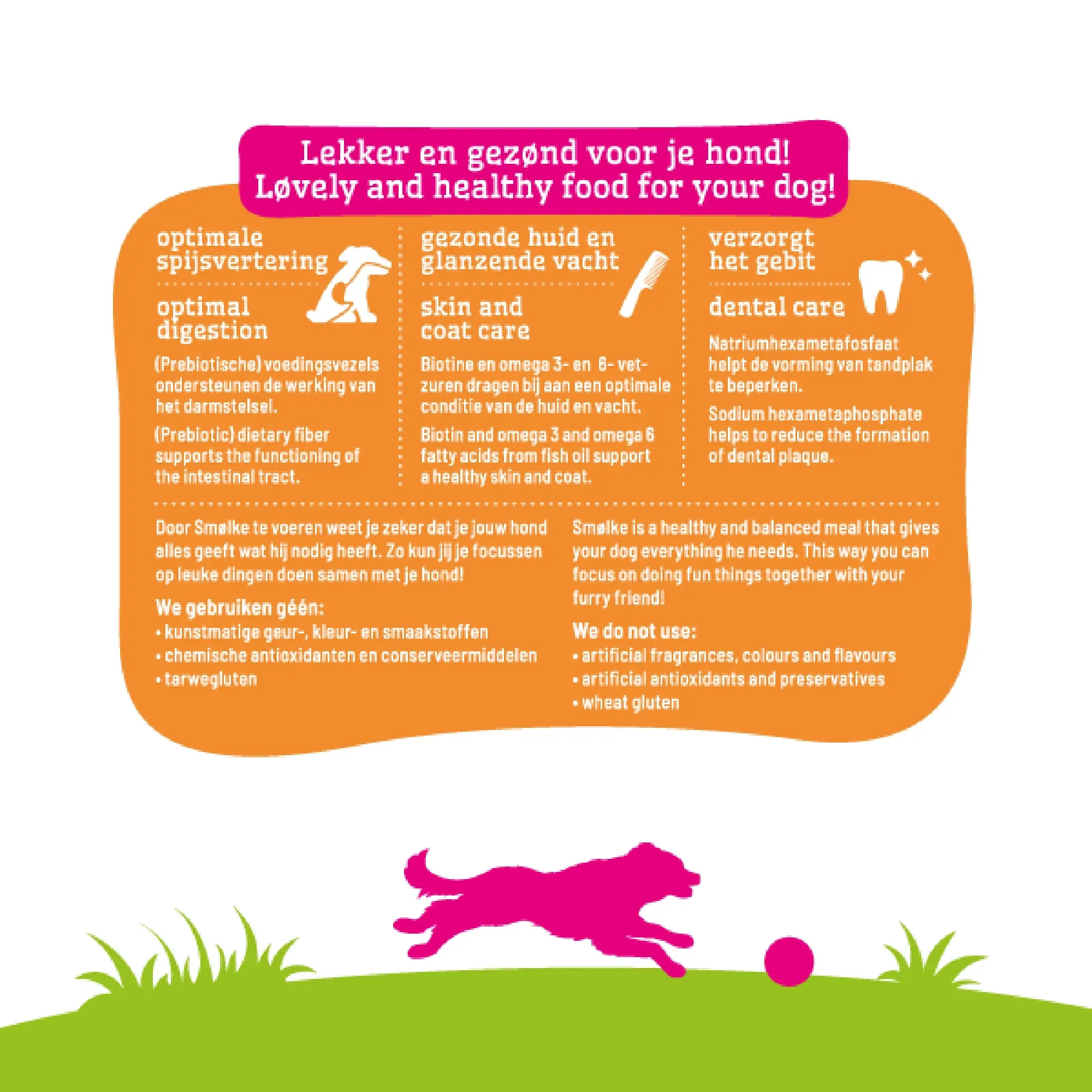 Vetzuren omega-3 en omega-6 zeggen jou misschien niks, maar het effect zie je in de huid en vacht. De voedingsvezels helpen de werking van het darmstelsel een handje. En als toetje zitten er mineralen in die helpen tandplak tegen te gaan. Zo blijft ook jouw hond in topconditie met Smølke Adult Medium. Maar hoe zit het met de conditie van de baas voor de Medium-wandeling van vandaag? Veel plezier!