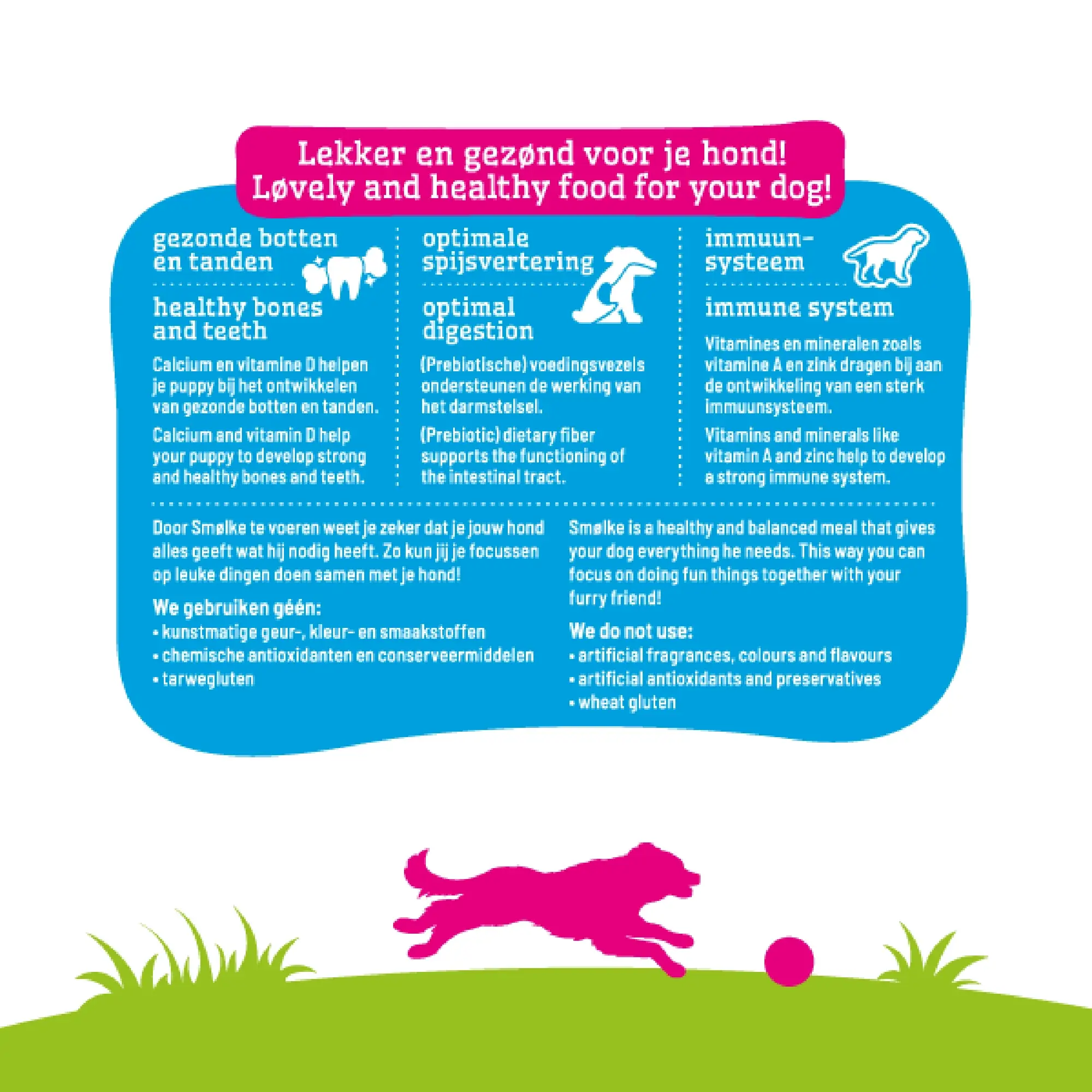 Wat we er nog meer in doen, helpt je puppy gezond op te groeien. Calcium en vitamine D helpen z’n tanden sterker te maken. (Grr...) Voedingsvezels ondersteunen het darmstelsel. En vitamine A en zink dragen weer bij aan een sterk immuunsysteem. Alles-in-1-voeding dus, zodat je in één keer de hele hønden-schijf-van-vijf kunt afvinken. Makkelijk toch? Hou je tenminste extra tijd over voor een spelletje. Max, pák ‘m!