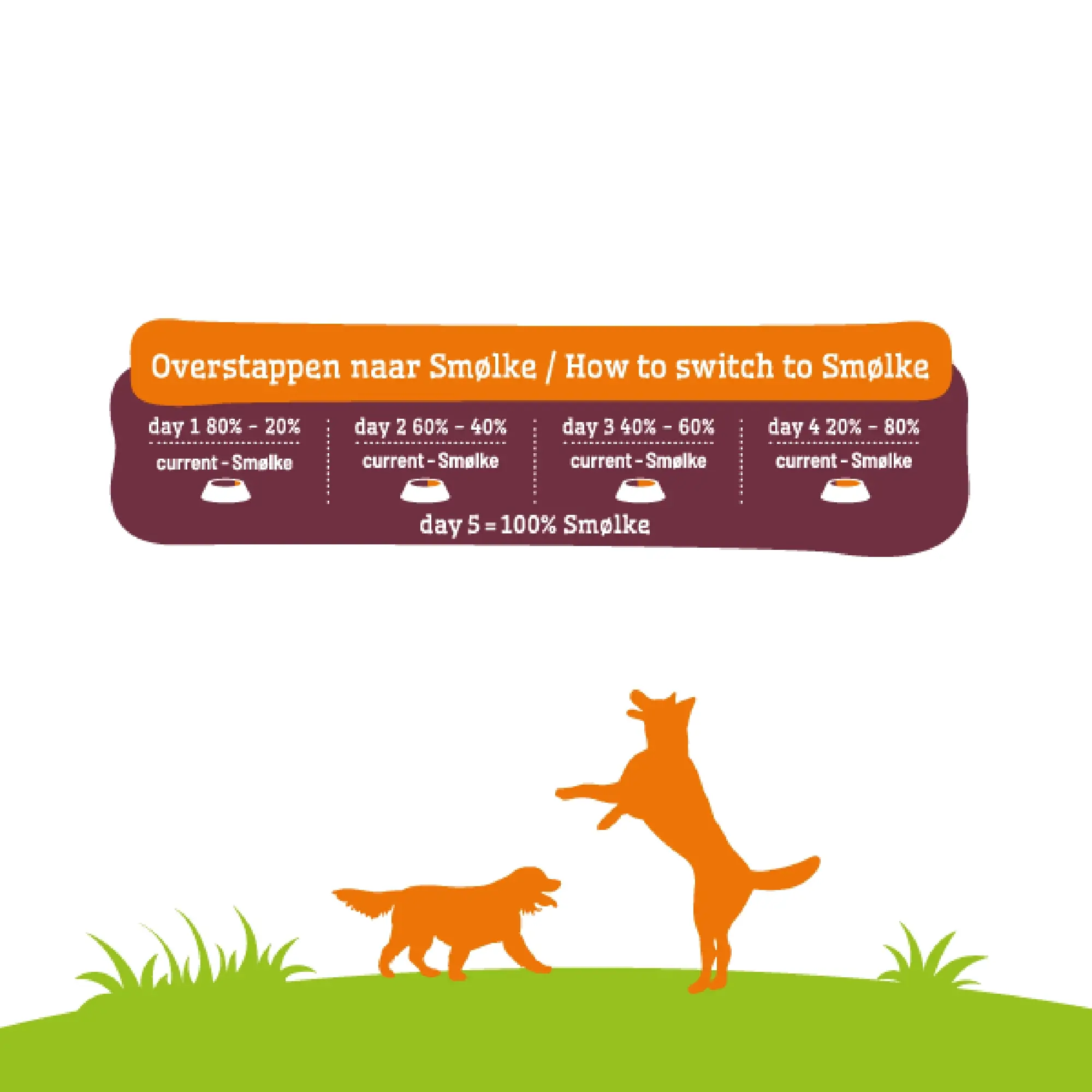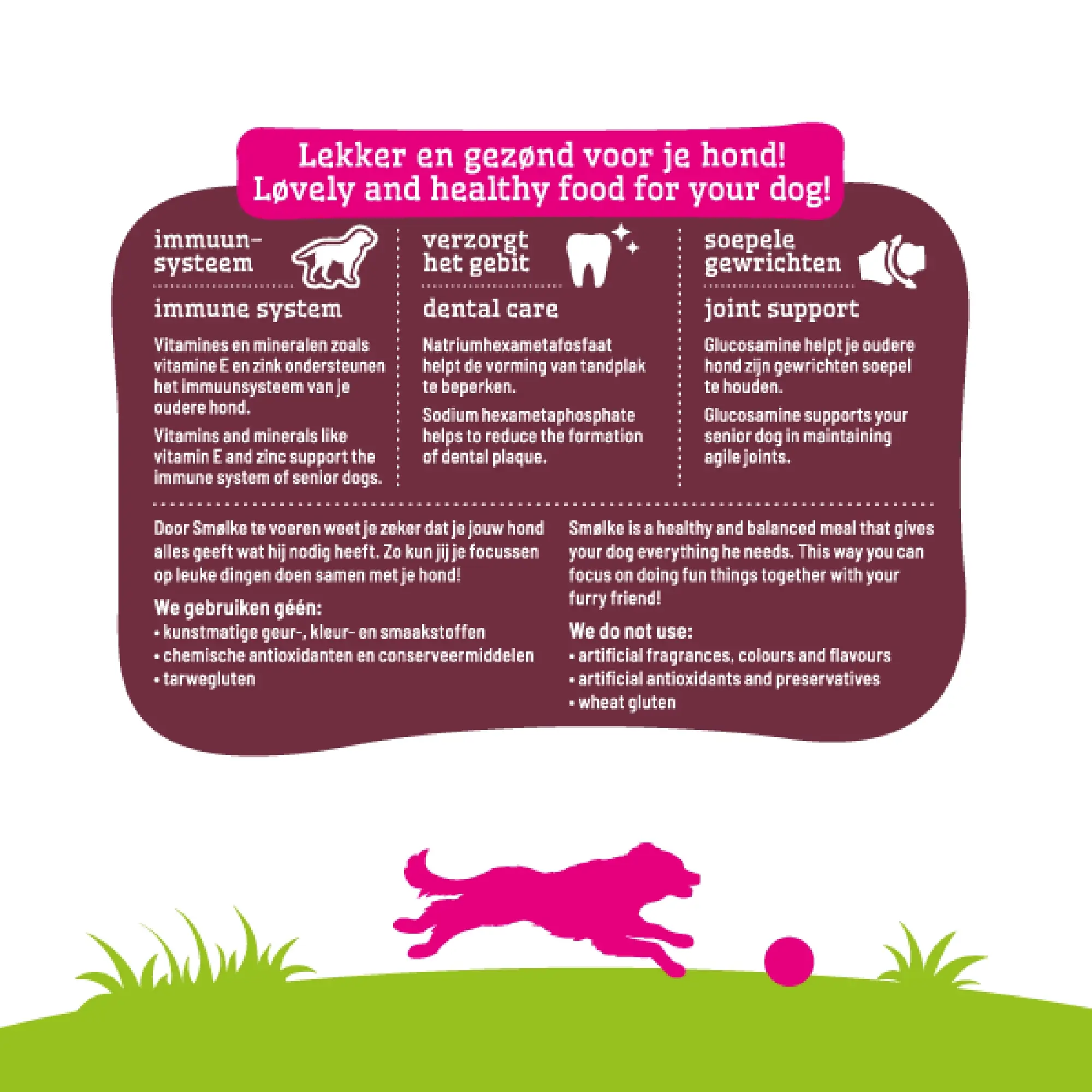 Smølke Senior Maxi is ontwikkeld voor alle honden die zes jaar of ouder zijn en meer dan 30 kg wegen. Met deze hondenbrokjes, gemaakt met natuurlijke ingrediënten, serveer je alles in één keer. Om te beginnen: het unieke eiwitprofiel van kip, vis en lam. Smølke besteedt ook meteen aandacht aan de specifieke eisen die ‘seniør’ stelt.