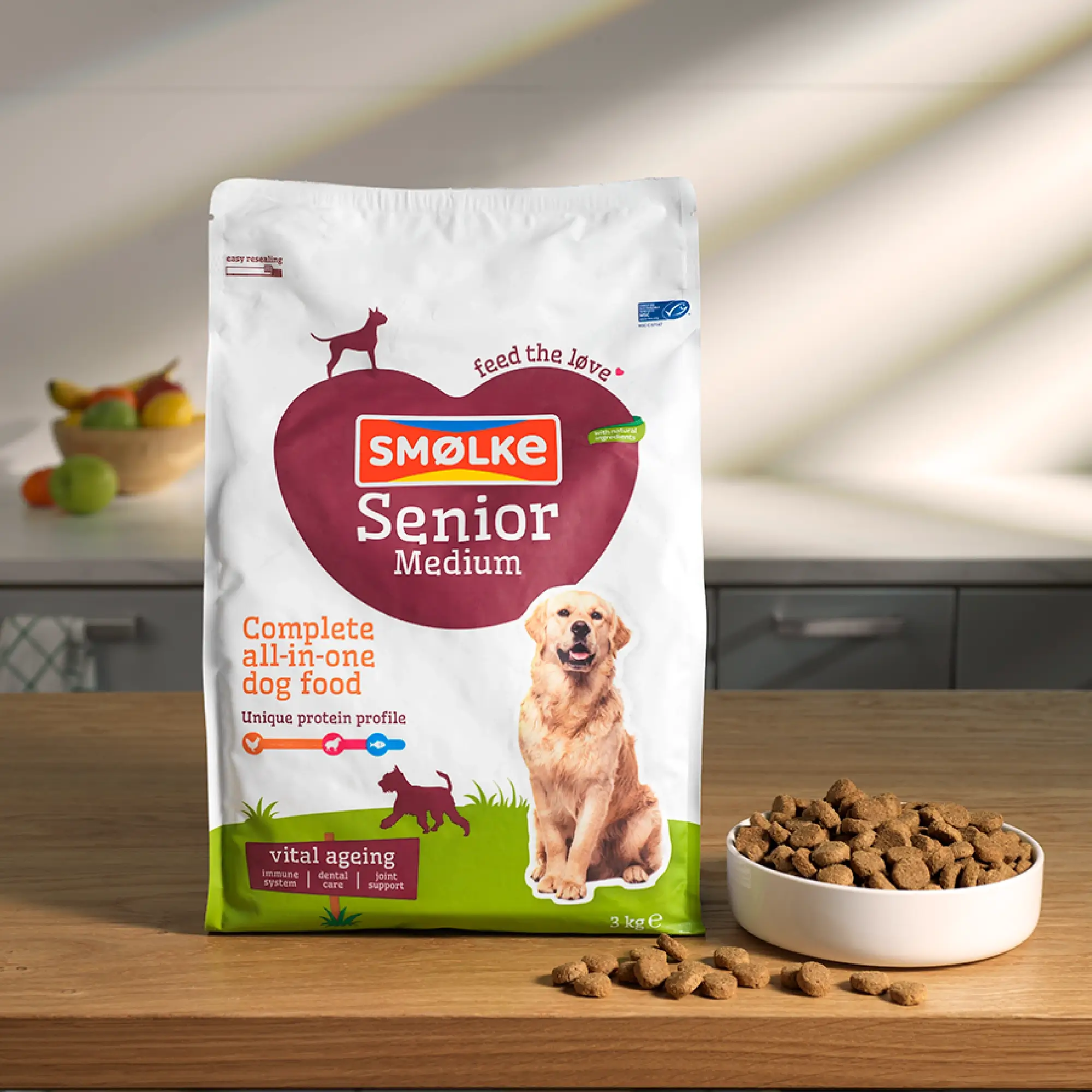 Smølke Senior Medium is ontwikkeld voor alle hondjes die zeven jaar of ouder zijn en tussen de 10 en 30 kg wegen. Met deze hondenbrokjes, gemaakt met natuurlijke ingrediënten, serveer je alles in één keer. Om te beginnen: het unieke eiwitprofiel van kip, vis en lam. Smølke besteedt ook meteen aandacht aan de specifieke eisen die ‘senior’ stelt.