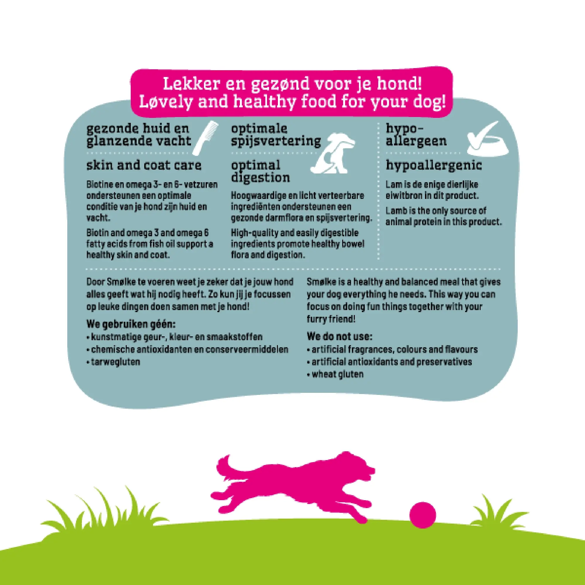 Met Smølke Sensitive Lamb geef je ook biotine en omega 3- en 6-vetzuren aan de dagelijkse maaltijd mee. Precies de bouwstenen die de optimale conditie van huid en vacht ondersteunen. En de licht verteerbare ingrediënten helpen ook bij een gezonde darmflora en een goede spijsvertering. Want ja, leuke dingen doen samen met je hond begint wel bij een gezonde viervoeter.
