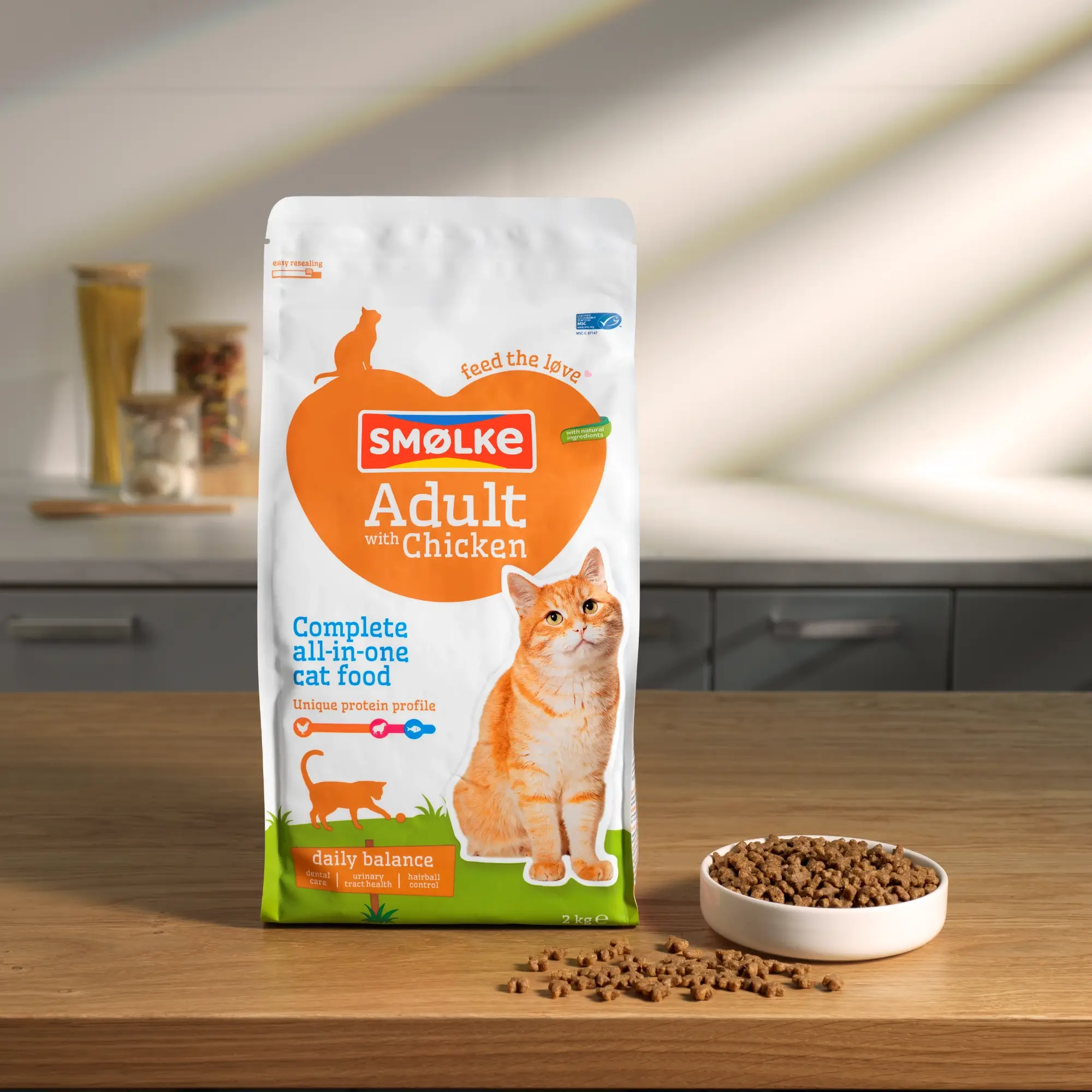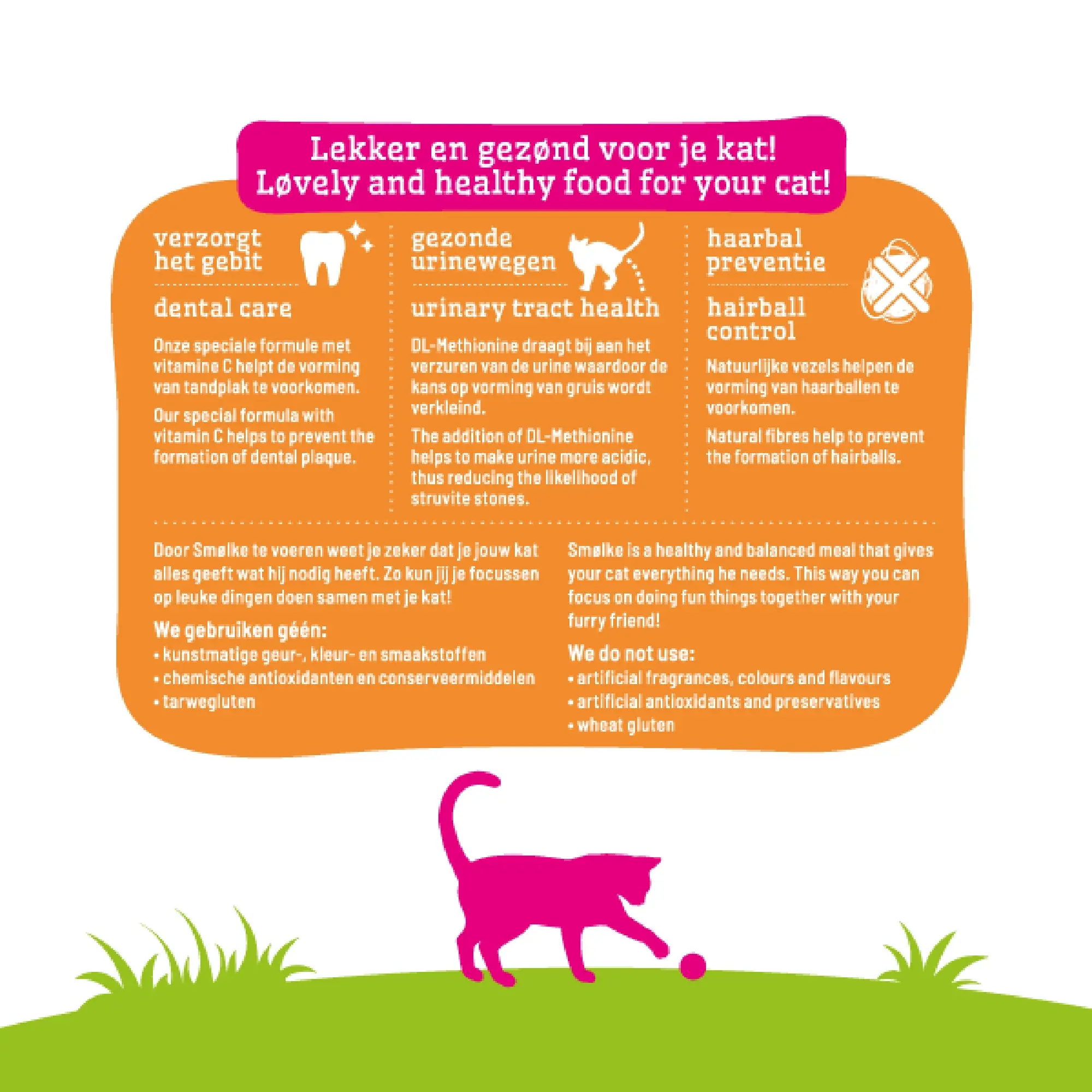 Een leven zonder tandplak bijvoorbeeld. De vitamine C in Smølke Adult with Chicken helpt aanslag voorkomen. En heb je weleens van DL-Methionine gehoord? Da’s het stofje dat meehelpt urine te verzuren, zodat je kat minder snel last heeft van gruis. Ook staan de kattenbrokjes bijna bol van de natuurlijke vezels. Je zou het moeten merken aan de verminderde haarballen. Dat speelt toch veel leuker, een kat die op en top gezond is?