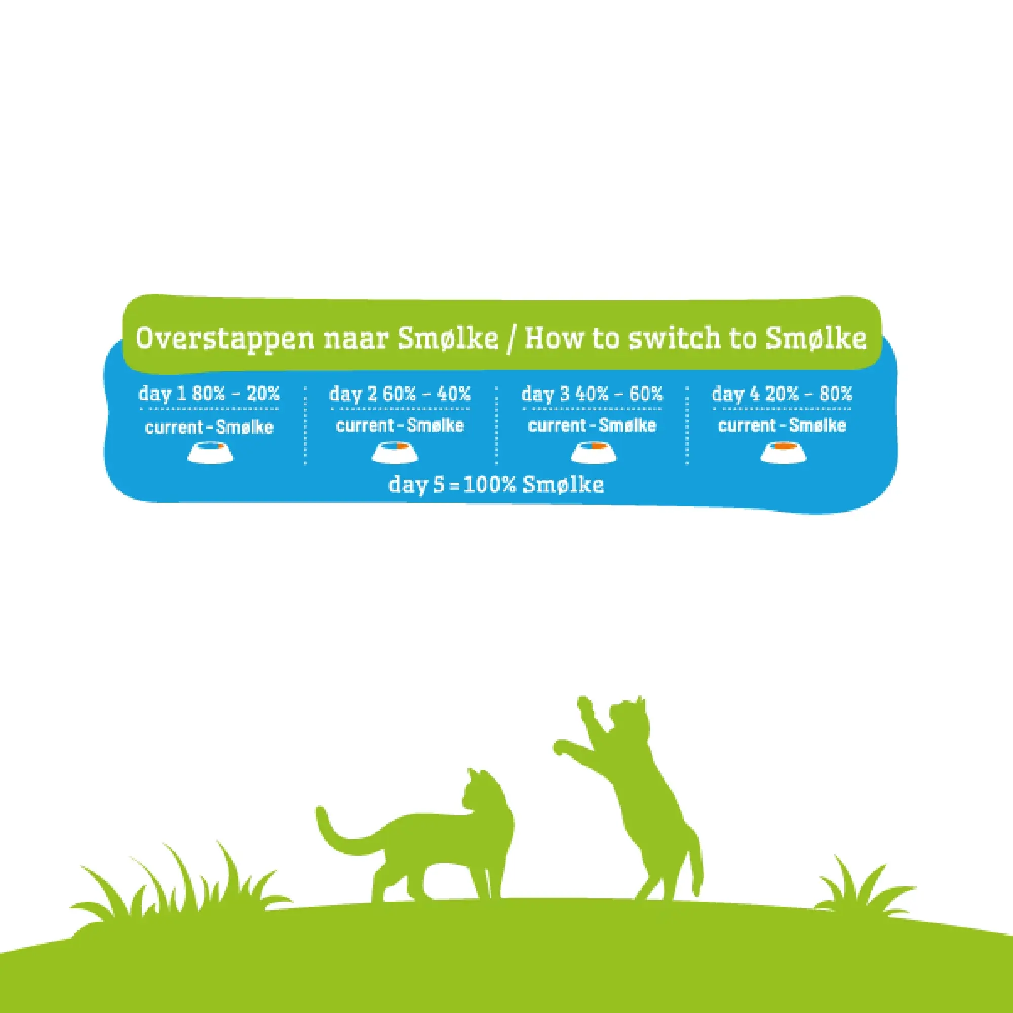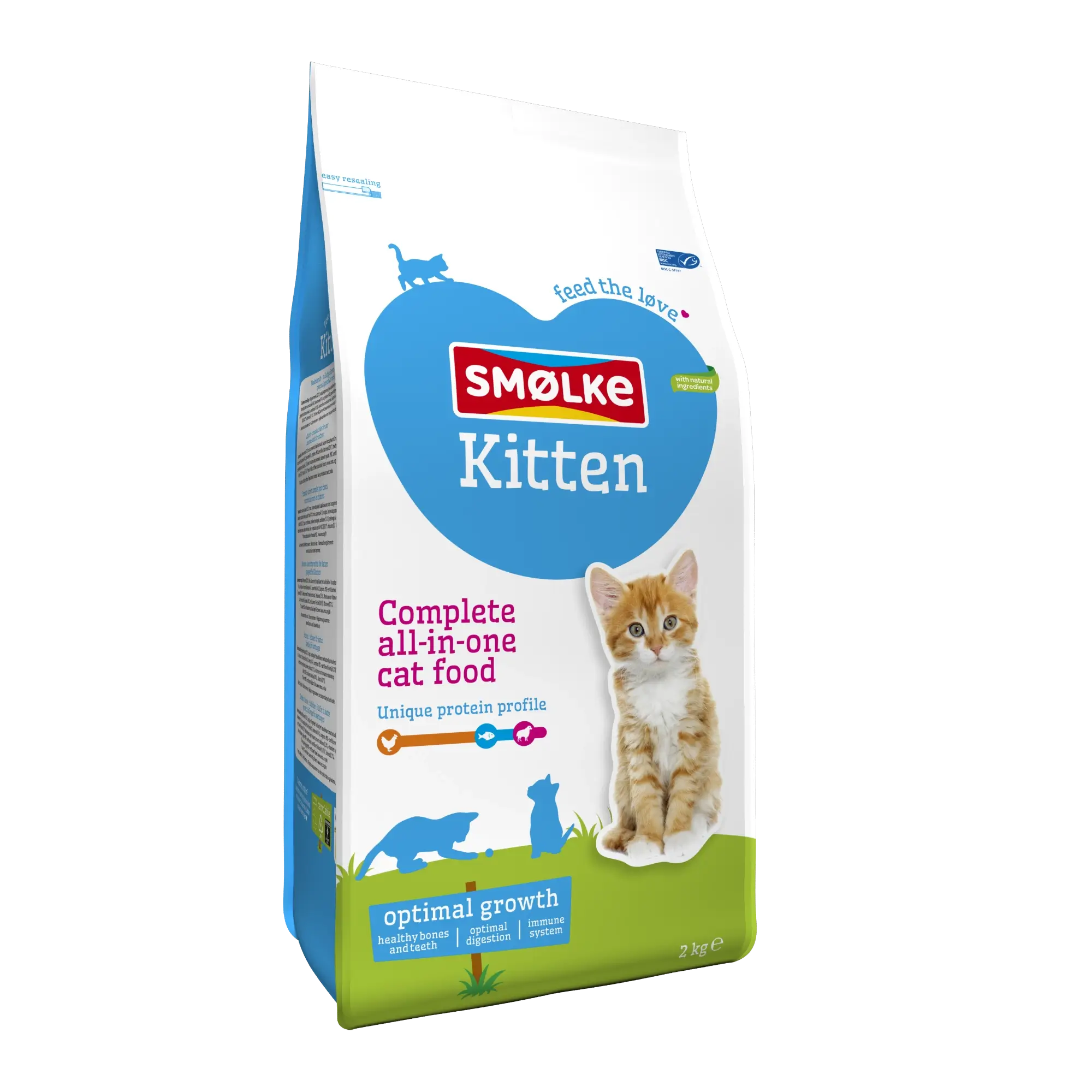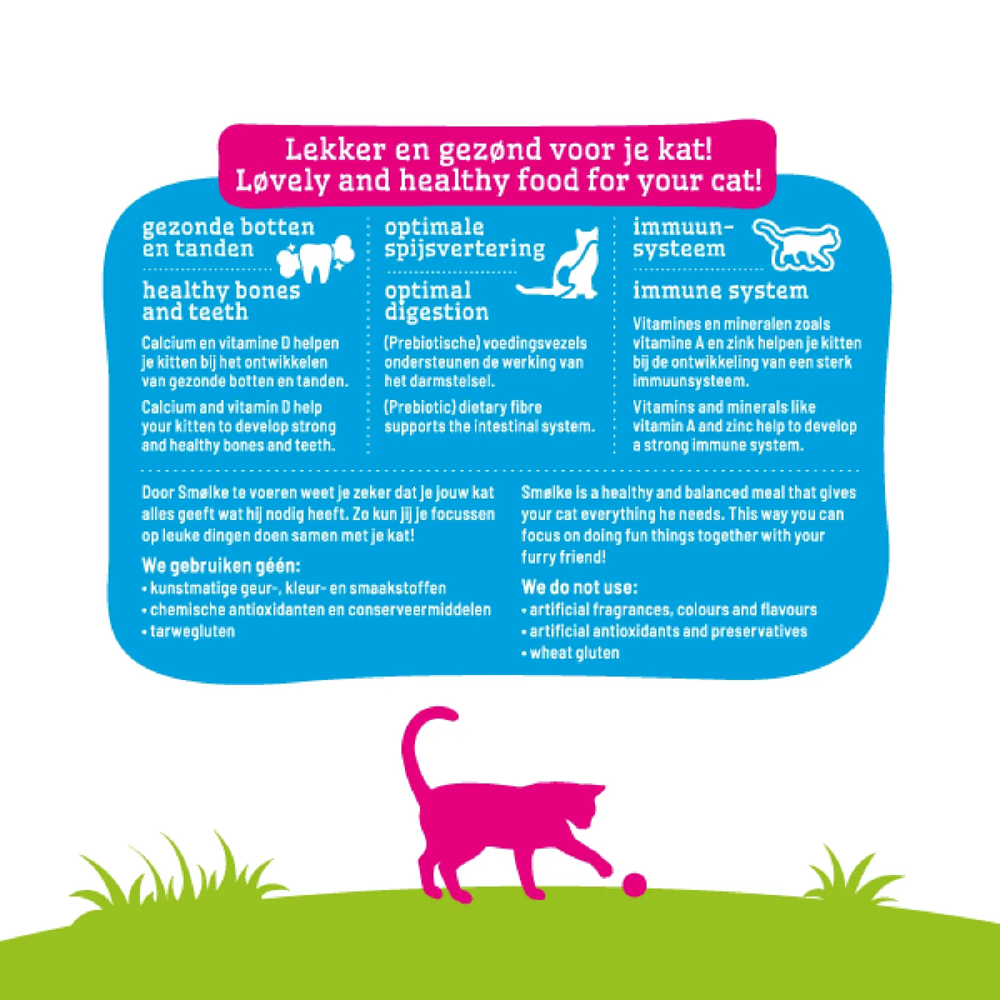 Tot en met een maand of 12 is je kitten nog in de groei. Smølke Kitten is exact afgestemd op wat de kleine wil. Om te beginnen: ons unieke eiwitprofiel van (verse) kip, vis en lam. Wat we er extra in stoppen, is goed voor botten en tanden. Of voor de werking van het darmstelsel. En het immuunsysteem vergeten we niet.